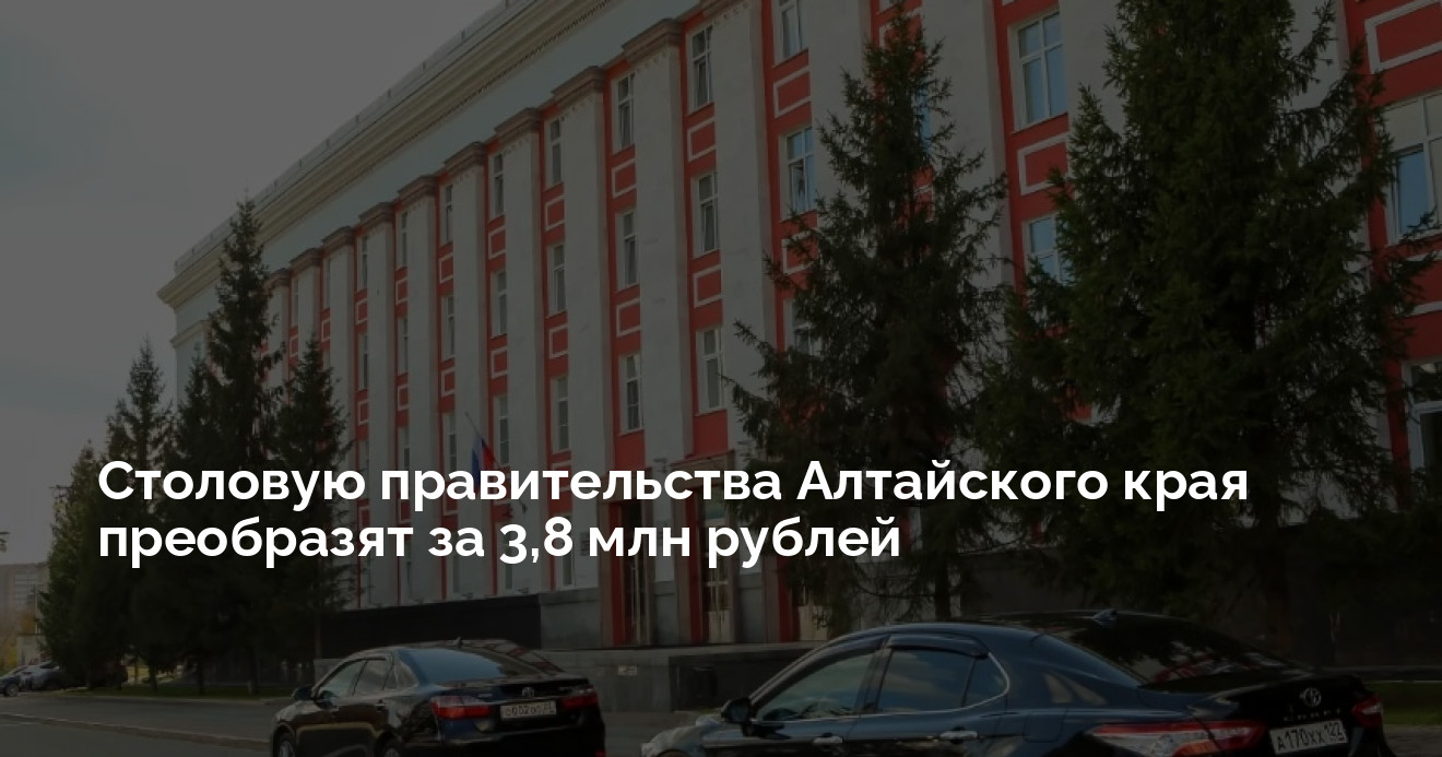 В здании правительства Алтайского края на проспекте Ленина, 59 в Барнауле проведут капитальный ремонт столовой. На эти цели выделено свыше 3,8 млн рублей. Соответствующий тендер размещен на портале госзакупок.