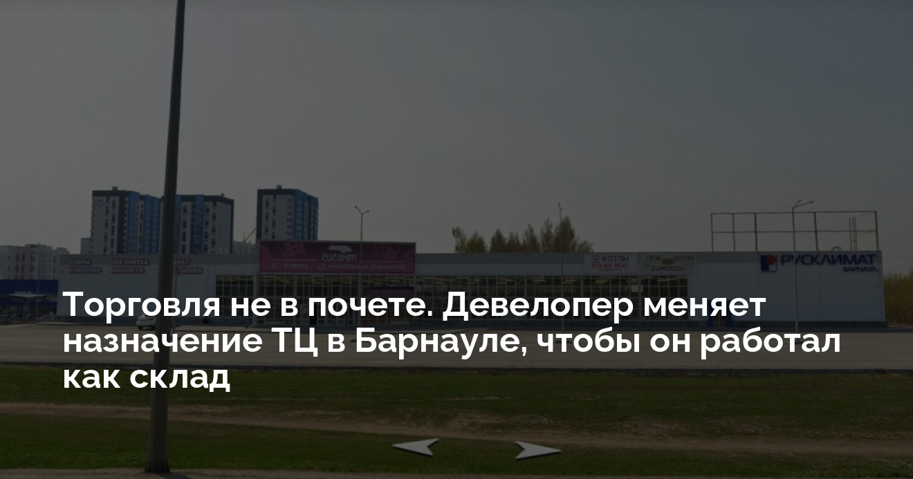 Таким образом, на Павловском тракте в Барнауле, где сформирован торговый кластер (ТРЦ «Арена», "Гранд Арена", «Лемана-ПРО» и другие), один из ТЦ может начать работать в режиме склада. Как писало издание «Алтайская недвижимость», тренд на невостребованность торговых площадей развивается во многом из-за роста онлайн-торговли в стране.
