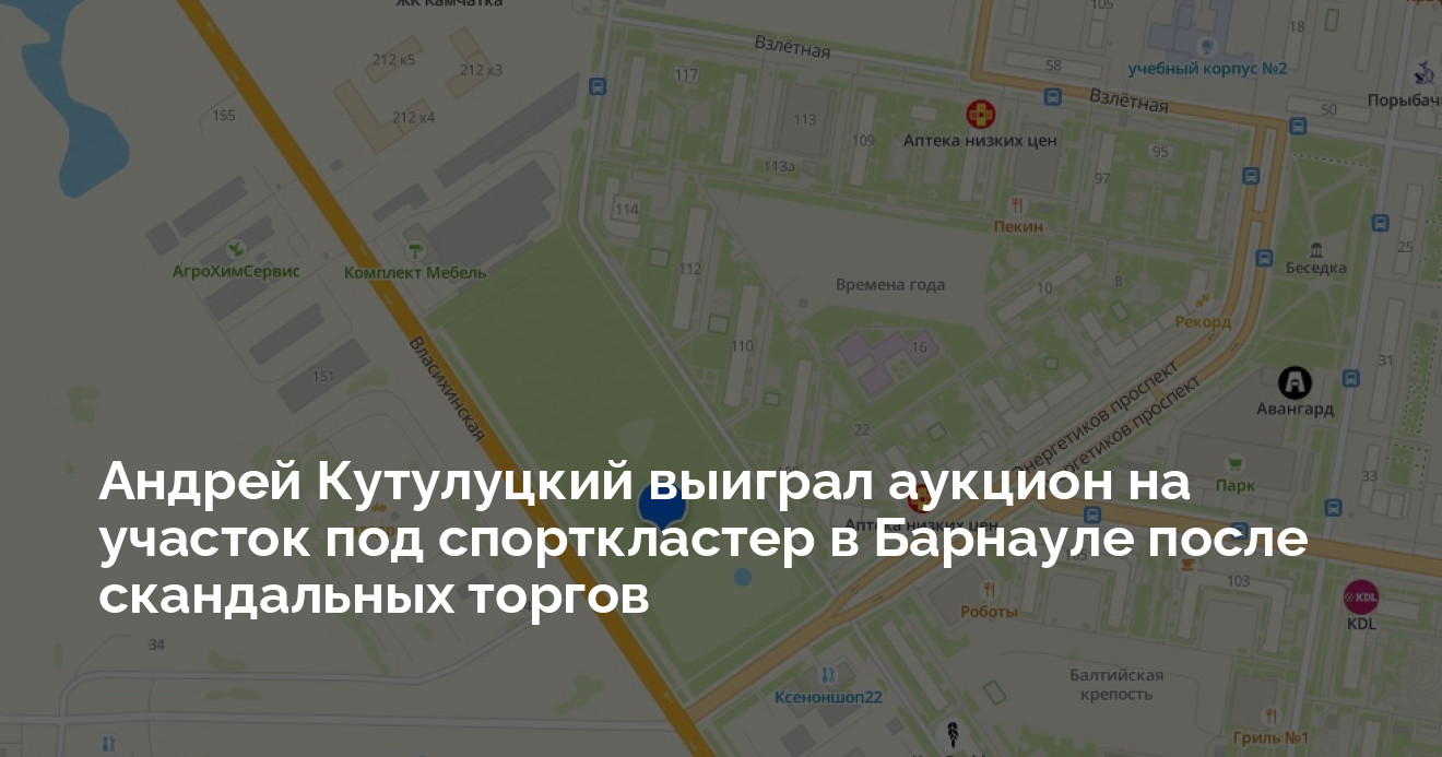 Крупный земельный участок в Барнауле, предназначенный под спортивный кластер, обрел нового арендатора после серии неудачных торгов. Право на его освоение на 10 лет и 8 месяцев за 22,56 млн рублей получил известный застройщик Андрей Кутулуцкий, победивший в аукционе компанию «Алтайские бетонные системы», связанную с Юрием Фрицем. Информация размещена на сайте ГИС Торги.