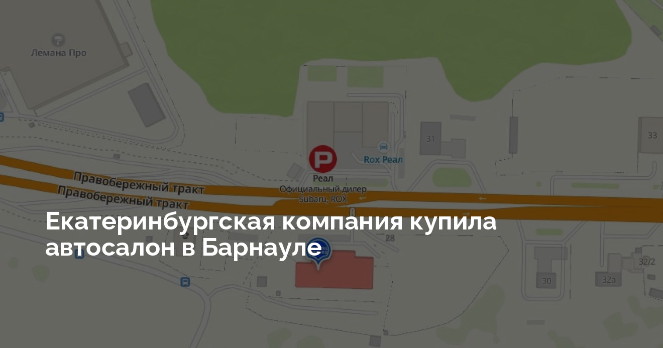 Екатеринбургская компания «Авалон» приобрела на торгах здание автосалона по адресу: Правобережный тракт, 26 в Барнауле. Сделка прошла в рамках процедуры банкротства местной компании «Реал», которую инициировала московская компания «Траст-девелопмент».