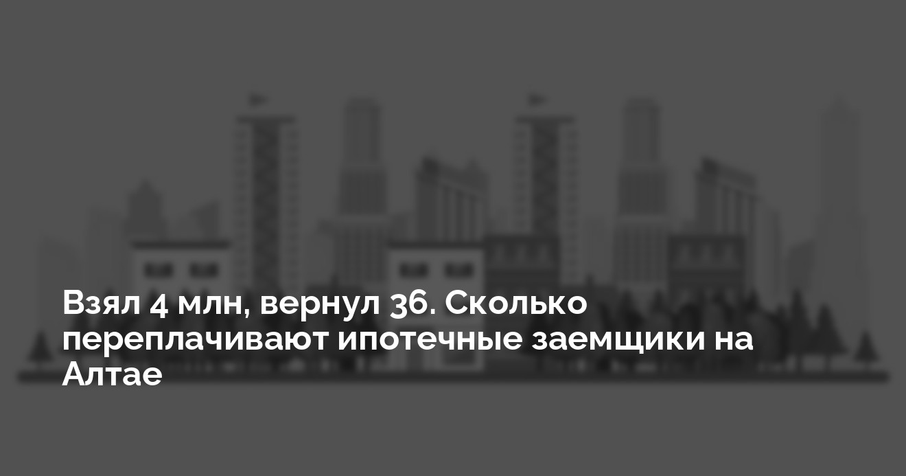 Для примера, если приобрести в Барнауле скромную двушку за 5 млн рублей с первоначальным взносом в 1 млн рублей, клиент возьмет у банка кредит в 4 млн, а вернет ему 36 млн рублей. Более того, в течение 30 лет он будет вынужден платить ежемесячно по 100 тыс. рублей.