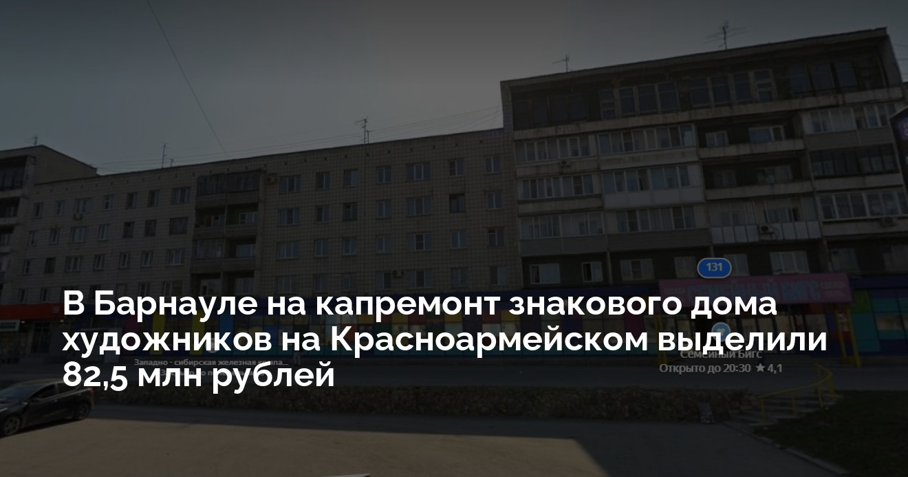 Одна из архитектурных достопримечательностей Барнаула советского периода — многоквартирный дом на проспекте Красноармейском, 131 — дождался капитального ремонта. Комитет муниципального заказа города объявил закупку на выполнение работ, начальная цена контракта составляет от 82,5 млн рублей.