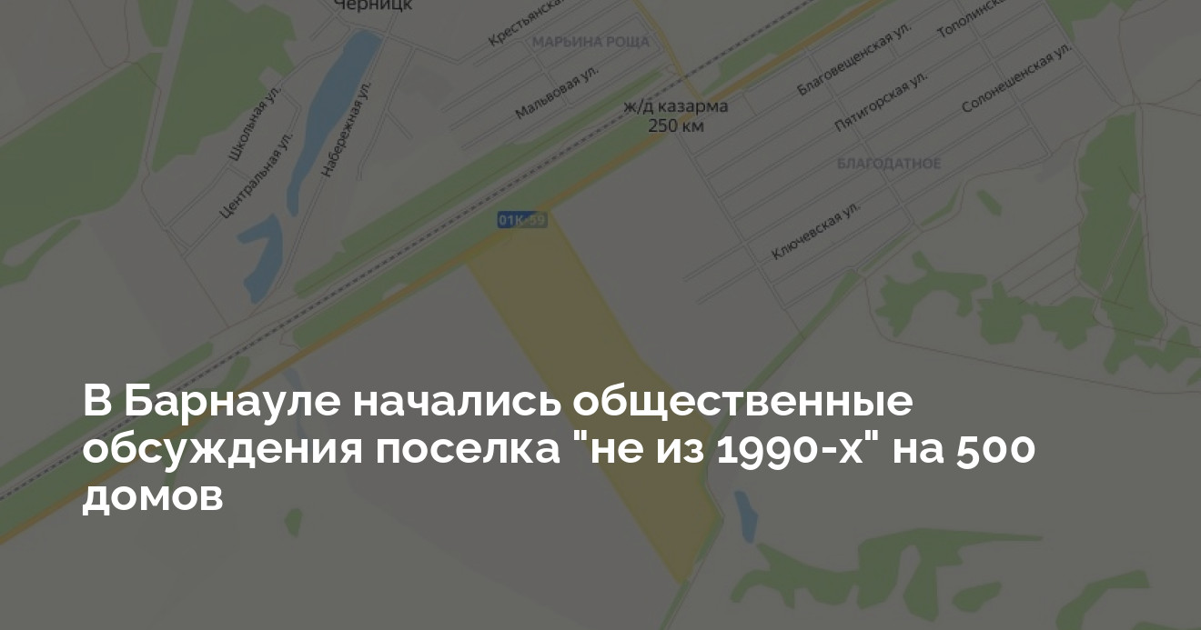 Обсуждения касаются участка с кадастровым номером 22:61:050601:1998 площадью 53,2 га. Он расположен напротив Черницка, в районе Марьиной рощи и Благодатного (ориентир – дом на улице Дачной, 1). Планируется, что в его границах построят индивидуальные жилые дома. Процесс освоения территории рассчитан до 2035 года.