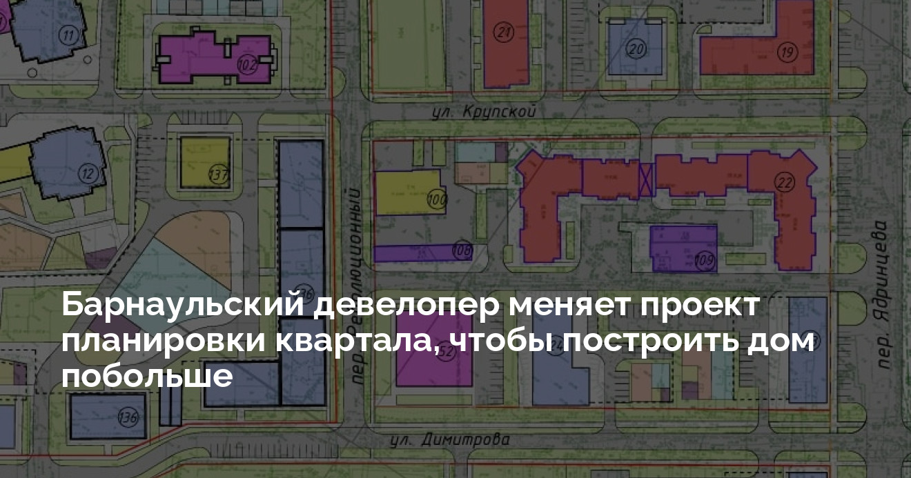 Заявитель формирует участок на углу улиц Димитрова, Ядринцева и проезда Димитрова. По первоначальному проекту там планировался 10-этажный дом. В глубине квартала должны были построить 15-этажку, однако компания «Т-Строй», которая выкупила там землю, получила разрешение только на 10 этажей (ЖК «Титул»).